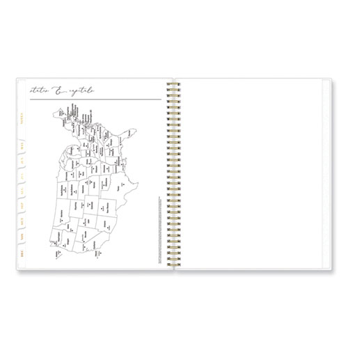 If orderly checklists and new notebooks make you happy, this weekly/monthly planner is the book for you. With a robust, 50-page Note-It section, you’ll have plenty of space to organize and format as you see fit, while tracking all of the important details about your projects throughout the year. Perfect for efficient, on-the-go planning, this large planner also offers to-do layouts and goal-setting pages for the ultimate in organization. Spacious weekly and monthly calendar views help you keep your day-to-day details, plans and ideas straight. Two-page per week spreads feature a vertical layout, with the week laid out on the left and compartmentalized sections for to-do’s, goals and notes on the right. Two-page per month spreads offer spacious lined blocks, reference calendars and dedicated notes space. Each month also features durable, laminated reference tabs for easy access. Dedicated pages for your yearly goals, contacts and important dates provide a place for those essential details you don’t want to forget. Heavy poly cover with a beautiful Leah cover art design delights with its opulent florals, and gold twin-wire binding completes the look. Six un-tabbed bonus monthly spreads cover the last six months of the previous year for easy annual transitions, and a dual-sided storage pocket keeps the loose extras you might pick up along the way.