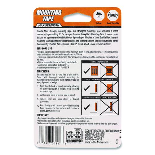 Gorilla® Max Strength Mounting Tape, our strongest mounting tape, includes a mesh reinforced layer making it 1.5x stronger than our Heavy Duty Mounting Tape. It mounts in an instant for a permanent bond that holds 3 pounds per 4 inches of tape! Gorilla Max Strength Mounting Tape is perfect for indoor projects and sticks to smooth and rough surfaces. Bonds to painted walls, mirrors, plastic, metal, wood, glass, ceramic and more. Weight limits may vary depending on surface texture, porosity and flatness of surface. Both surfaces must be completely flat to make full contact with adhesive.