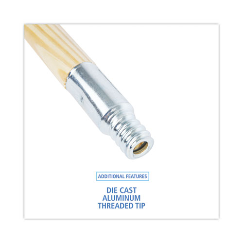 Long-lasting, die-cast aluminum threaded tip is secured to a natural lacquered hardwood broom handle. Composed of a durable handle and metal thread, this handle is strong and reliable. The handle’s smooth grip is ideal for regular use with or without gloves in any environment. The clear-coated finish is easily wiped clean and repels dust. The metal threaded tip is compatible with brooms using the same threading and assembles without tools.
