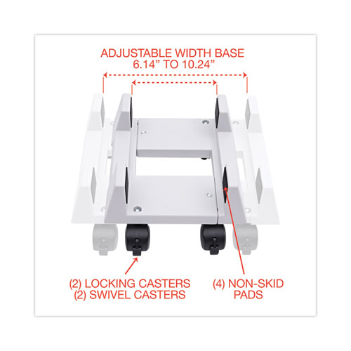 Innovera® Mobile CPU Stand is constructed with non-skid padding that securely holds a CPU in place. The adjustable base expands from 6.14″ to 10.24″ in order to accommodate a wide range of CPU sizes. Built with durable construction to ensure strength and stability for the most fragile equipment. The base contains four wheels, two locking casters and two swivel casters for mobility or stationary use.