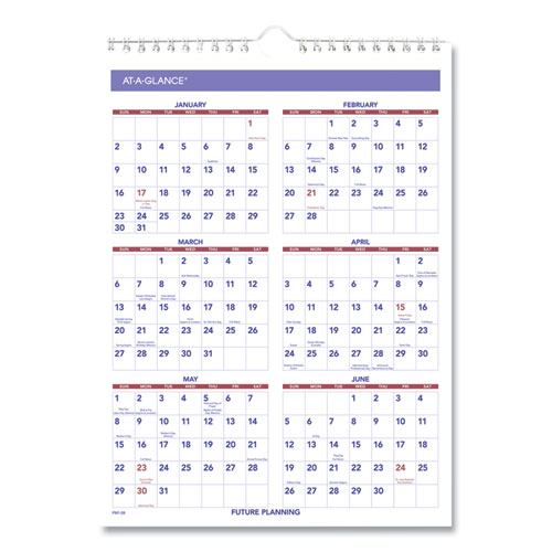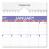 One-month view, plus a yearly calendar reference. Ruled daily blocks. Federal holidays printed in red. Wirebound with hanging loop. Full chipboard back. Printed on high-quality paper.