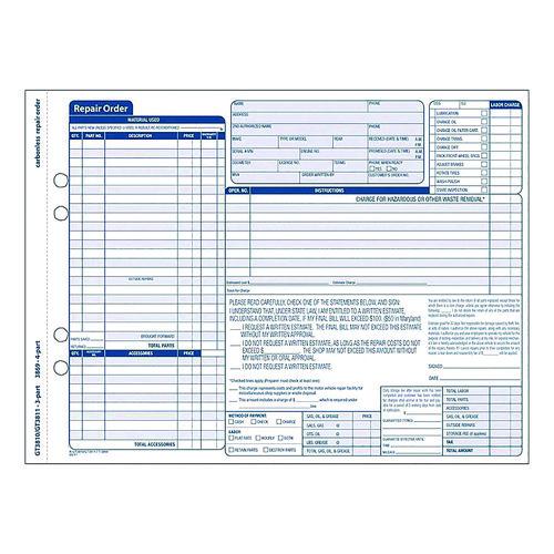 Acceptable for use in all 50 states, Adams® Multipart Auto Repair Work Order Forms can be an invaluable tool. Each form features a preprinted layout designed specifically for detailing auto repair jobs, with areas for customer/vehicle information, hazardous materials instructions as well as a job list with parts, labor and additional accessories itemized. Multi-part format lets you provide a receipt and keep copies for administrative tasks. Carbonless paper produces clean, smudge-free results.