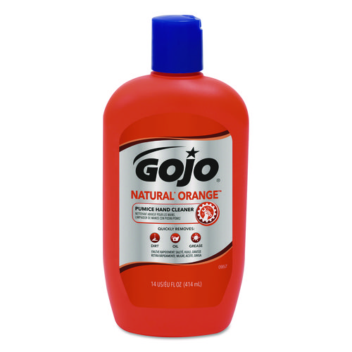 The GOJO NATURAL ORANGE Pumice Hand Cleaner has an appealing orange-citrus scent and pumice scrubbing particles to clean a broad range of industrial soils, dirt, and grease from hands in a quick-acting lotion formula. This biobased GOJO Natural Orange Pumice Hand Cleaner is composed of biodegradable products (Laureth-7, glycerin, limonene), renewable agricultural materials, or forestry materials.