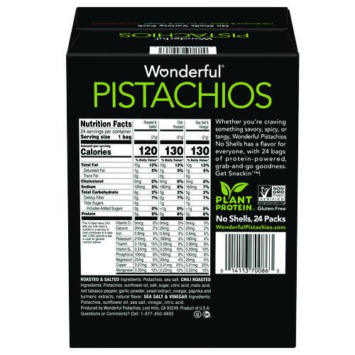 Wonderful Pistachios No Shells have literally come out of their shells. Same delicious taste, but with a little less work for you. A good source of protein, pistachios are a healthy addition to any gathering: from parties to picnics, they are a healthy choice for snacking on the go and around the house. Additionally, with no shell, these pistachios are perfect for cooking, snacking and as a tasty and crunchy salad topper.