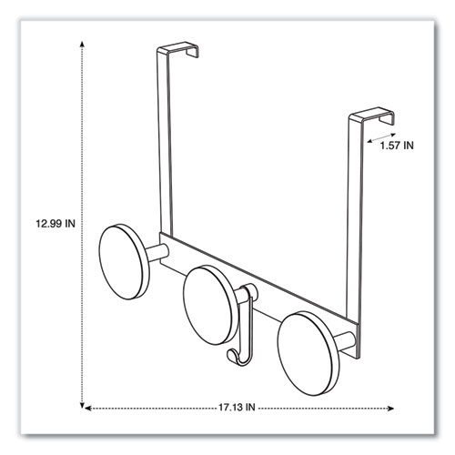 This wall coat peg features three rounded black plastic pegs, one hook for accessories, one metallic holder, and two hooks to fix over the door. Very easy to affix without any tools thanks to its hook especially designed for doors (1.5 inches). Can also be used on cubicle partition walls of 1.5 inches. Very sturdy coat pegs that hold up to 20 pounds per hook. Stylish design that blends in with any office environment. Kind to clothes thanks to the large rounded tips on the ABS plastic coat pegs. Silver powder coated steel and ABS plastic.