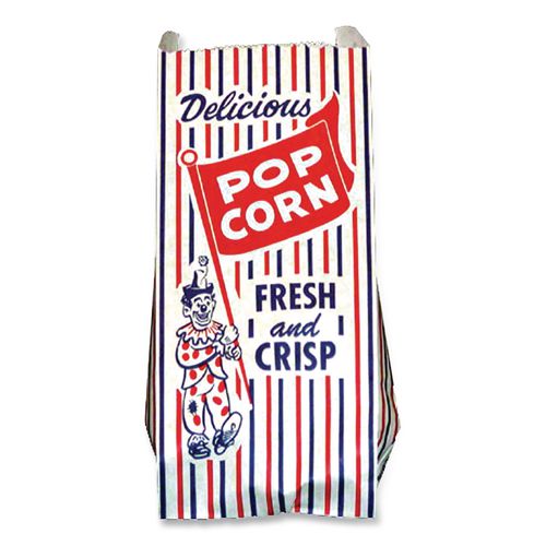 Pinch-Bottom Paper Popcorn Bag, Delicious Popcorn: Circus Clown Icon Labeling, 4″ x 1.5″ x 8″, Red/White/Blue, 1,000/Carton