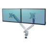 Elevate your workspace with the Fellowes Platinum Series Dual Monitor Arm, designed to reduce neck and eye strain while maximizing desk space. The Platinum Series ergonomic monitor arm supports up to 40″ and 17.6 lbs, making it ideal for home, office or gaming setups. Featuring fully independent arms with gas spring technology, the Platinum Dual Monitor Arm makes adjustments effortless and enables flexible viewing angles with 360° rotation and +/-45° screen tilt. The quick-fit VESA plate ensures an easy setup, attaching securely to desks via grommet or clamp. Featuring two integrated USB ports at the base, the Platinum Series allows you to keep your devices powered while maintaining a clutter-free workspace thanks to the innovative cable management system. Combining quality, durability, and ease of use, the Platinum Dual monitor arm provides exceptional value and flexibility for any workstation.