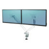 Elevate your workspace with the Fellowes Platinum Series Dual Monitor Arm, designed to reduce neck and eye strain while maximizing desk space. The Platinum Series ergonomic monitor arm supports up to 40″ and 17.6 lbs, making it ideal for home, office or gaming setups. Featuring fully independent arms with gas spring technology, the Platinum Dual Monitor Arm makes adjustments effortless and enables flexible viewing angles with 360° rotation and +/-45° screen tilt. The quick-fit VESA plate ensures an easy setup, attaching securely to desks via grommet or clamp. Featuring two integrated USB ports at the base, the Platinum Series allows you to keep your devices powered while maintaining a clutter-free workspace thanks to the innovative cable management system. Combining quality, durability, and ease of use, the Platinum Dual monitor arm provides exceptional value and flexibility for any workstation.