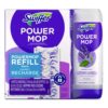 Mop smarter with the Swiffer PowerMop, an all-in-one mopping system that gives you a mop and bucket clean in half the time. The multi-surface mopping pads have 300+ scrubbing strips that reach deep into grooves and grout to remove sticky spills and daily dirt and grime. The pre-mixed floor cleaner breaks down tough, sticky messes and dries fast, no need to rinse!