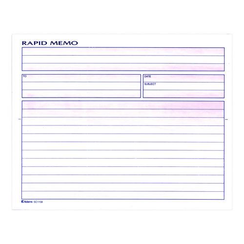 Draft and distribute memos quickly and efficiently. The Adams® Rapid Memo Pad features vertical-orientation forms with a ruled block at top for special notes, a formatted block in the middle for date/subject/recipient details and a ruled block at bottom for the body of the memo. Located between the middle and bottom blocks, a row of handy priority and confidentiality bubbles help you communicate how each memo should be managed. Carbonless, multi-part format allows you to pass along priority memos and keep a copy for yourself. Spiralbound at top.