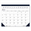 The top is bound with a blue leatherette strip that matches the pad’s reinforced corners for extreme durability throughout the entire year. Each month is perforated for easy removal. Lightly ruled daily blocks help keep notations neat. Julian dates with days remaining and full-year reference calendar on each page. Made entirely of recycled materials.