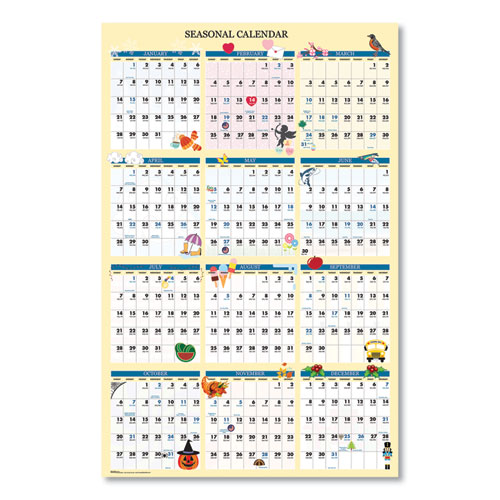House of Doolitttle 100% Recycled Seasonal Laminated Erasable Wall Calendar. Colorful monthly images that depict each month’s special holiday and season with bright lively designs on a full year view. This wall calendar is reversible, horizontal one side, vertical on reverse to fit any office design. Laminated write-on/wipe-off surface easily erases with a damp cloth for changing plans. Includes a black water-soluble marker and hanging tabs. Printed on 100% recycled paper with soy-based inks.
