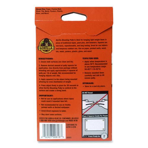 For the toughest jobs on planet earth®. Ideal for hanging light weight items in place of traditional tapes, push pins, and fasteners. Gorilla Mounting Putty squares are non-toxic, repositionable, and long lasting. Great for use indoors and temporary outdoor use. Use on paper, painted walls, wood, tile, metal, posters, plastic, glass, and more!