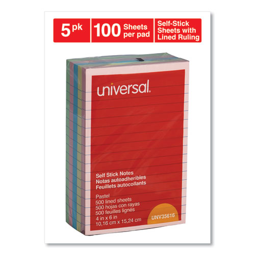 Self-Stick Note Pads, Note Ruled, 4″ x 6″, Assorted Pastel Colors, 100 Sheets/Pad, 5 Pads/Pack