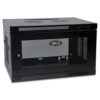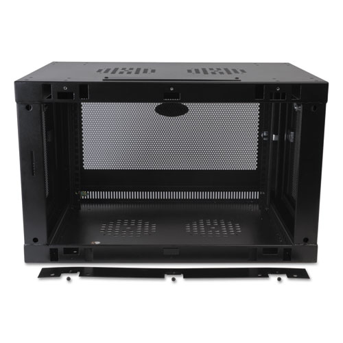 Designed to house EIA-standard 19-inch rack equipment in network wiring closets, retail locations, classrooms, back offices and other areas with limited floor space where you need equipment to be secure, organized and out of the way. Constructed from heavy-duty steel with a durable black powder-coated finish, the cabinet has a maximum load capacity of 200 pounds. The side panels and front door lock securely to help prevent damage, tampering or theft. The front, top, bottom and removable side panels are vented, which allows air to flow freely and keep equipment cool. The reversible front door can open left or right by rotating the cabinet 180° before mounting. Convenient top and bottom ports allow easy cable routing. Comes fully assembled and ready to mount to the wall.