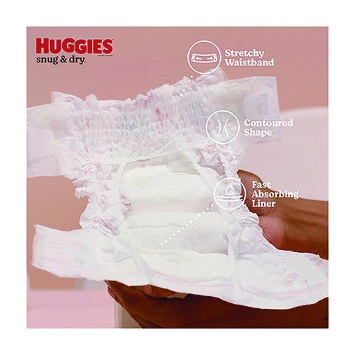 Huggies® Triple Layer Protection absorbs wetness in seconds and up to 23 times its weight to help keep your baby dry and happy. Snug & Dry™ baby diapers have a narrow crotch width, a stretchy waistband and a contoured shape to help support healthy growth and development; a wetness indicator of a yellow line that changes to blue when wet lets you know when it’s time for a diaper change. Disposable diapers are hypoallergenic and free of fragrances, parabens, elemental chlorine and natural rubber latex for healthy, huggable skin. Huggies® help prevent leaks for up to 12 hours, day or night, whether your baby is sleeping, crawling and walking.