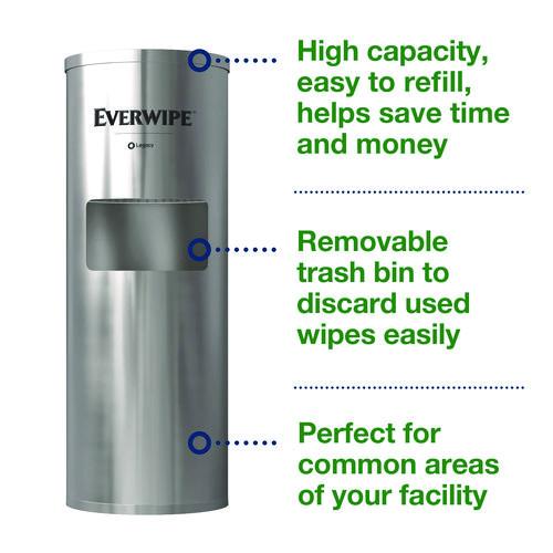 The stainless steel dispenser stand keeps you ready for business, providing your customers with easy access to wet wipes. This jumbo roll dispenser allows for high volume usage, and needs refilling less often, saving you time and money. The sleek and modern stainless steel finish blends in with any commercial decor for a clean-looking environment. This standalone wipe dispenser includes a trash bin to discard used wipes. Compatible with Everwipe by Tork W12 refills.
