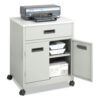 Enhance your office efficiency with this durable and versatile steel machine stand, designed to support most office machines while keeping supplies neatly organized. The scratch-resistant laminate top provides a spacious and sturdy surface, perfect for printers, copiers or other essential equipment. Built for lasting durability, the steel frame with a powder coat finish resists wear and tear, maintaining a sleek, professional appearance. The double-door enclosed cabinet offers secure supply storage, featuring a fixed interior shelf for neatly organizing paper, toner or other office essentials. A convenient pullout drawer provides easy access to smaller supplies, ensuring everything you need is within reach. Designed for effortless mobility, the stand moves smoothly on four durable casters, with two locking wheels to keep it stable when needed. Whether for a corporate office, home workspace or shared print station, this functional and stylish machine stand is the perfect space-saving solution for a well-organized and efficient work environment. Upgrade your office setup today!