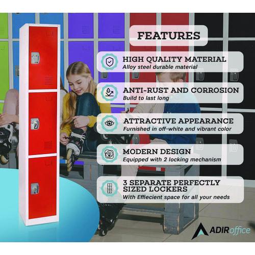 Crafted from high-quality steel, this locker is built to last and withstand the test of time. It is available in seven vibrant colors, making it a stylish addition to any office or school environment. With ample storage space for textbooks, clothes, personal belongings, and more, this locker ensures that your items are always organized and secure. Each locker door can be locked independently with included keys or accompanying locks, providing optimal security for your peace of mind. The minimalist design of our locker makes it suitable for a wide range of spaces. They all come equipped with coat and bag hooks, making organization easy and accessible. Proper air circulation is enabled with vented doors, keeping your items fresh and dry all day long. Additionally, each door features a metal nameplate that can be used for locker assignments or personalization. Assembling the locker is a breeze too with complete instructions and installation guidance.