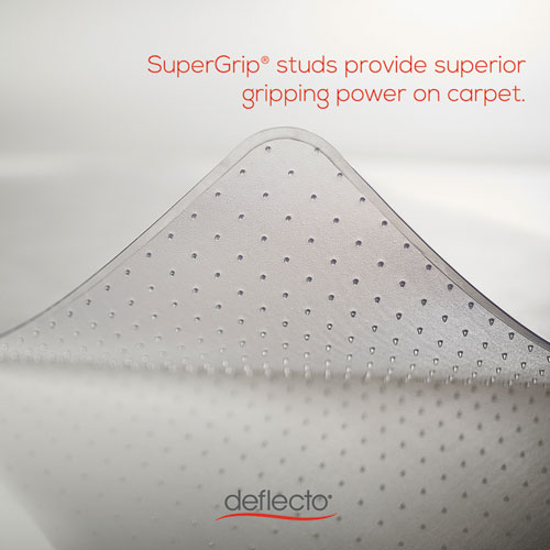 The SuperMat® chair mat is a versatile choice for frequent use on carpets up to 1/2″ thick and is well-suited for a variety of commercial and home office applications. Easy-glide rolling surface provides smooth chair movement to help minimize stress and strain on users back, legs and feet. Bottom studs grip the carpet securely and keeps the chair mat from moving. Deflecto’s Free and Clear® non-orthophthalate, non-cadmium formula promotes a healthy work environment.