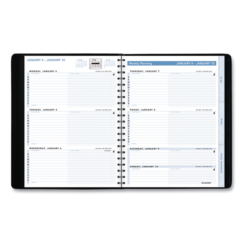 For the ultimate list maker and planner. Features tabbed sections for to-dos, notes and special information (800 numbers, planning, web addresses and four-color world map). One week per two-page spread: half of each day for appointments, half for to-do’s and notes. Past, current and future months reference. Storage pocket. High-quality paper with superior ink bleed resistance.