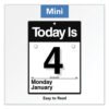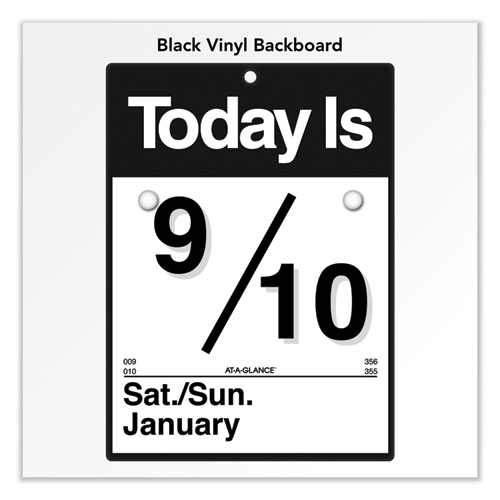 A calendar is a necessity in every workspace, and this dependable classic makes it easy to keep track of each day, one day at a time. Each sheet boldly displays either a single weekday or the weekend (with Saturday and Sunday combined). Extra-large black print on a bright white background delivers a high-contrast effect to help ensure just about anyone can check the date at a glance. Rigid, black vinyl backboard with eyelet simplifies hanging the calendar on cubical panels, room dividers, sheet-rock walls, plaster walls and more. Yearly refills available-use the handy backboard year after year.