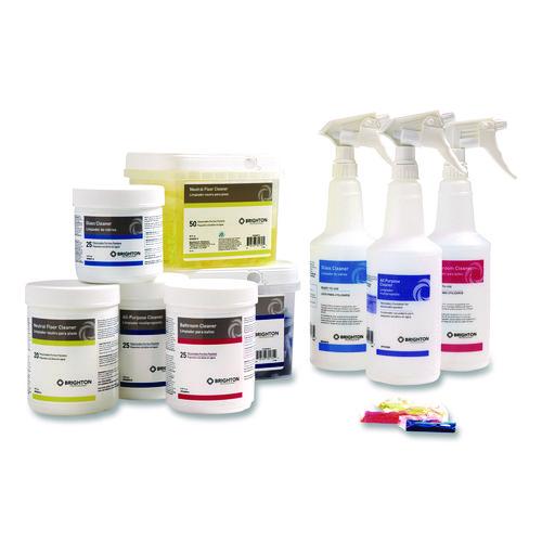 Brighton Professional™ 32 oz bottle and sprayer is designed for use with Dissolvable Portion Packets. Simply dilute one portion packet in 1 qt of warm water for a ready to use cleaner solution.