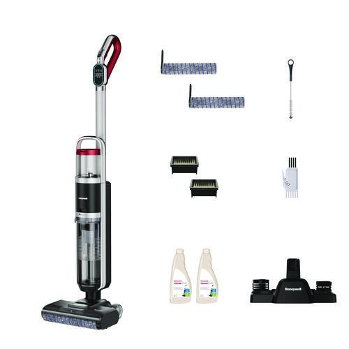 The Honeywell professional 3-in-1 Cordless Floor Cleaner is engineered to vacuum and wash hard floors simultaneously, and perfect for quick carpet clean-ups (without water). This high-performance device is equipped with a high-tech synchronized digital wet and dry motor for powerful suction and features a motorized multi-surface power scrub soft roller for an in-depth clean. Our innovative patent-pending design separates wet and dry waste, complemented by the stainless-steel precision spray nozzle and large, separate clean and dirty water tanks that ensure high-efficiency cleaning. Commercial-grade metal side support tubes add an extra layer of durability. The easy-to-use LED display and intelligent voice prompts, along with the advanced Smart Auto Clean Mode, optimize your cleaning experience. With an easy-change, high-capacity battery pack providing up to 35 minutes of runtime, and an easy-charge base with accessory storage, maintaining your device is virtually effortless. The package includes two power scrub rollers, two wet/dry filters, and two bottles of multi-surface floor cleaner for the ultimate cleaning solution.