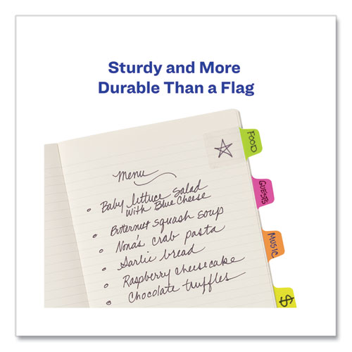 Sturdy, self-adhesive repositionable tabs that make indexing, marking, referencing and separating documents quick and easy. Writable on both sides of the tab, and the adhesive body is clear so you can see text underneath. Durable enough to turn pages like a divider, and they stick securely but remove cleanly with no residue. Ideal to use for organizing and marking key information in notebooks, files, books, planners and more. Perfect for home, office and school.