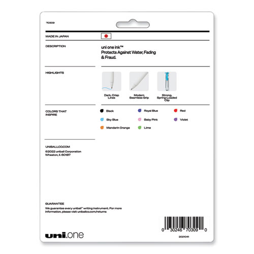 Experience the next stage of ink technology innovation with uniONE Retractable Gel Pens. The revolutionary gel ink is specially formulated with large pigments that do not absorb into the paper. This results in writing and drawing that is darker, brighter and ultra vivid. Quick drying gel pens resist smudging, smearing and bleeding, making them ideal for crisp and easy to read notes and assignments. A 0.7 mm medium tip strikes the perfect balance between bold and detailed lines. The sleek white barrel with integrated anti-slip grip makes this pen a stylish writing tool. Additionally, the functional wire clip indicates the gel ink color, as well as opens wide for easy attachment to papers, notebooks or folders. uni-ball® uniONE gel ink delivers superior writing performance whether at school, at home or at work.
