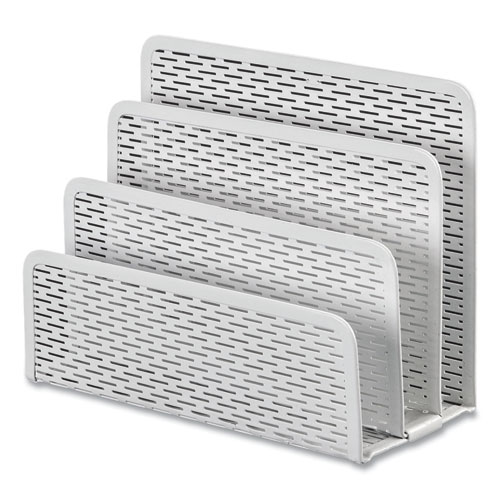 Strong, professional grade punched metal with decorative urban style slotted pattern. High quality satin finish complements any décor. Features protective feet to prevent surface wear and scratches on the desktop surface. Reinforced rounded edges provide durability and attractive detailing. Provides three compartments to sort letters, memos, or other materials helping to organize your desktop and reduce clutter.