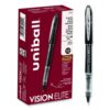 Create ideas as vividly as can be imagined with Vision Elite Rollerball Pens from uni-ball featuring a bend-resistant stainless steel tip and a tungsten carbide rollerball. Capped roller pens deliver smooth, intense lines with unparalleled definition – useful for note taking, list making, signing checks and legal documents, and even uniquely embellishing creative writing projects. Innovative uni Super Ink technology effectively entraps the gel ink into the paper, producing fraud, fade and water-resistant documents that resist check washing or bleaching. These Vision Elite pens have a special design that withstands cabin pressure variances without leaking, making them useful for travelers. Exclusive Uni-Flow Ink System ensures a consistent, delightfully fluid writing experience, and a translucent window ensures that you don’t run out of ink unexpectedly. Express your signature style with the sleek, modern design and elite performance of uni-ball’s Vision Elite Rollerball pen – no matter the altitude.
