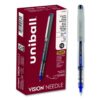 Stock your office, home or classroom with Vision Needle Stick Rollerball Pens from uni-ball featuring a strong, long lasting 0.7 mm fine point. These needle point pens are designed with a bend resistant tip for better accuracy. Even-flowing, pigment-based roller ink delivers a smooth writing experience for reliably smooth, vivid lines and a rich color for improved clarity and readability. Use these fine point rollerball pens to create perfect letters, numbers and graphics. Innovative uni Super Ink technology effectively entraps the liquid ink into the paper, producing fraud, fade and water-resistant documents that resist check washing or bleaching. The 0.7mm fine needle point allows you to create ultra-precise, straight edge lines with ease. The exclusive Uni-Flow Ink System ensures a consistent, delightfully fluid writing experience, and a translucent window ensures that you don’t run out of ink unexpectedly. Enjoy beautiful clean lines and give all of your ideas a burst of brilliant color with this classic style fine point rollerball pen.