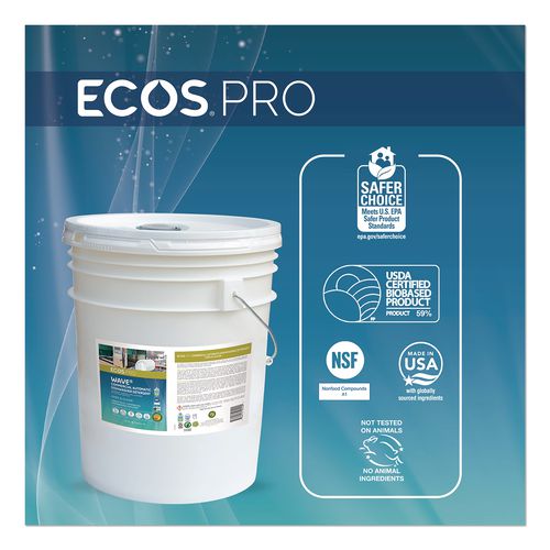 Make your plates, utensils, and glasses shine with this ECOS PRO Wave® automatic commercial dish machine detergent liquid. This detergent is formulated specifically for commercial automatic dishwashing machines. Cuts through grease and dried-on food. Will not etch china, glass or plastics, and is safe for fine items like porcelain, silver and crystal. Works in all temperatures and in all automatic dishwashing machinery. This pH balanced formula is made using several sustainable, plant-powered surfactants. Made without dyes; graywater and septic safe. Not tested on animals. Manufactured in a facility that is LEED Zero Carbon, LEED Zero Waste, and LEED Zero Energy Certified.