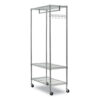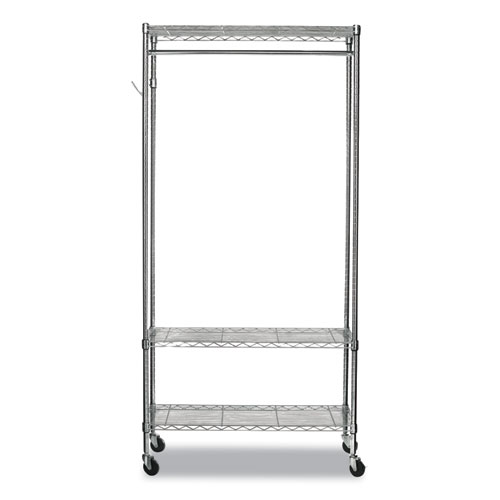 Time-saving design assembles in minutes without tools. Strong welded wire construction that allows air circulation and helps reduce dust buildup. Double-sided for quick access to items. Rack features hanging rod for garments, five support hooks for umbrellas, bags, and other items to accommodate your needs. Three shelves adjust in 1″ increments and support 350 lbs. on each shelf. Four casters for quick mobility and two lock when it has reached your destination. Total unit capacity is 500 lbs. if used with casters. Hangers not included.