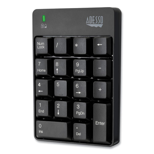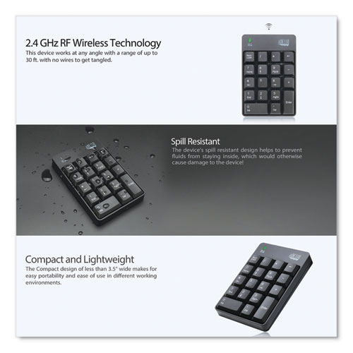 The Adesso WKB6010UB 18-key wireless keypad is extremely compact and lightweight. Its wireless feature eliminates any unnecessary wires and keep your working station neat and organized. Quiet membrane key switches provide a quiet typing experience that last up to five million keystrokes. Perhaps the greatest feature that the WKB601UB has is that it is spill resistant. The structural design of the casing is meant for fluids to exit out of the unit in case of accidental spills. Next time when you accidently spill drinks while using your numeric kepad you can be assured those fluids will not trap inside the keypad causing damage to your device.